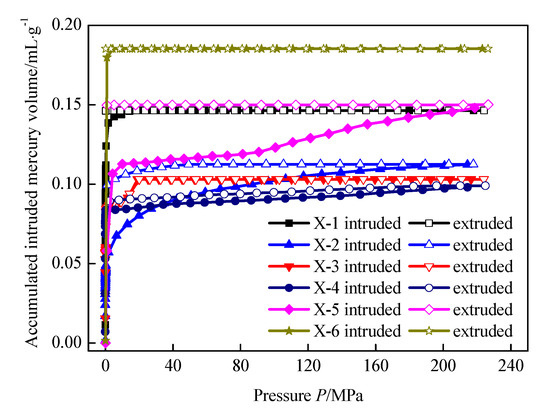 Accumulated intruded/extruded mercury volume versus pressure curves.
