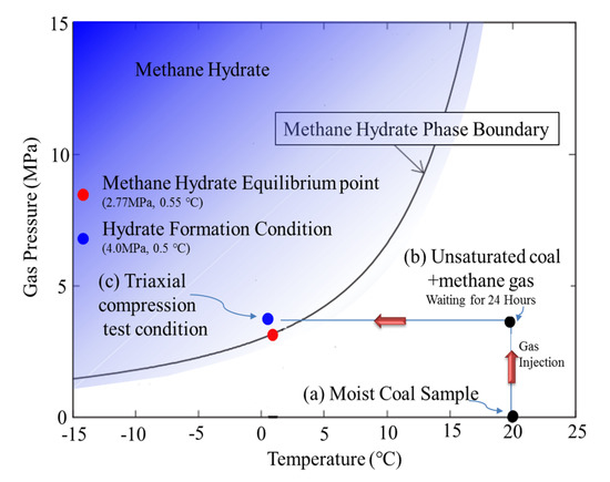 Proper thermodynamic conditions are needed for MH formation, which are low temperature or high pressure [29]. Calculation of MH saturation can be referred to Reference [11]. Note that the volume of samples was assumed constant during hydrate formation process, and water in the coal sample was completely transformed to hydrate with methane under a specified temperature and pressure [13,26,30,31,32]. The hydrate formation and triaxial compression process are schematically shown in Figure 5. We chose an appropriate thermodynamic condition (0.5 °C, 4 MPa) to ensure hydrate formation in coal samples. In Figure 5, the left part in blue above the MH phase boundary represents a stable region for the hydrate formation.