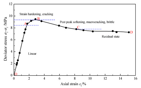 Figure 6 shows a stress–strain curve of the tested coal sample. This curve can be divided into four stages. OA represents stage 1, namely a linear elastic region. In this stage, the particles inside the coal pores were squeezed without generation of cracks. AB is the post-yielding and pre-failure stage. In this region, a shear movement occurred between the particles, leading to the formation of cracks. However, the MH–coal mixture could still sustain some further deformation without losing its capacity. BC shows the post-peak regime, with the propagation and the extension of cracks. Therefore, the stress of the coal sample gradually decreased. CD illustrates the residual state of the mixture.