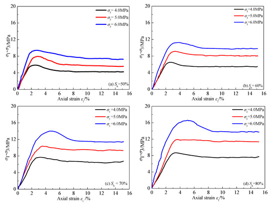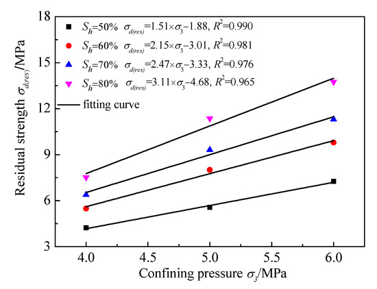 Figure 11 presents that σd(res) increased linearly with σ3. σd(res) increased from 4.43 MPa to 7.40 MPa for the MH–coal mixture when Sh increased from 50% to 80%.