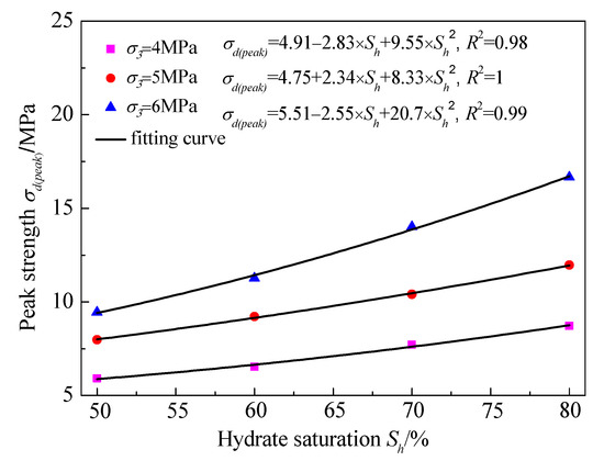 Relationships between the peak strength (failure strength) (σd(peak)) and the hydrate saturation (Sh), along with relationships between the peak strength and the confining pressure, are displayed in Figure 8 and Figure 9. Table 3 summarizes the typical strength and the deformation indices from tests. It was observed in Figure 8 that saturation had a significant impact on the peak strength of specimen. For each confining pressure, the peak strength increased with the increased saturation. At the confining pressure of 4 MPa, when Sh was increased from 50% to 80%, the peak strength increased from 5.86 MPa to 8.68 MPa. In addition, the relationship between the peak strength and the hydration saturation can be captured by a quadratic polynomial function. This trend is similar to the finding by Miyazaki et al. [16], who discovered the peak strength increases at higher saturation. For high-saturation samples, hydrate particles assemble collectively to increase the cementation of the specimen [26]. Waite et al. [29] revealed that bulk density of hydrate-bearing sediments also increases at higher saturation, indicating that the bonding structure inside the specimen is enhanced.