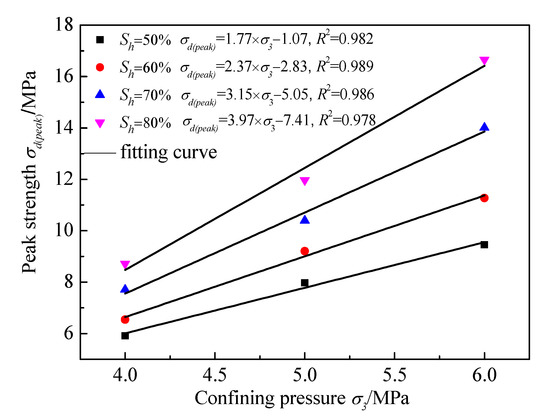 Figure 9 shows a larger confining pressure leads to a higher peak strength. Taken Sh of 50% as an example. σd(peak) could increase from 5.86 MPa to 9.38 MPa. The peak strength was increased because the higher confining pressure limited the movement of coal particles, resulting in more energy to break the cementation between particles. Furthermore, a linear relationship can be built between the peak strength and the confining pressure.