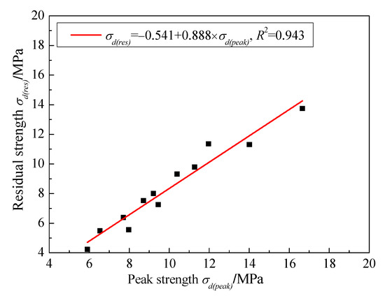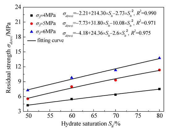 In underground mine engineering, the post-peak mechanical properties, such a residual strength of rock or coal mass, are essential for design of the project. Figure 10 plots the relationship between the residual strength (σd(res)) and the hydration saturation (Sh) for the MH–coal mixture. It was obviously identified that σd(res) increased with Sh. σd(res) increased from 4.43 MPa to 7.67 MPa for the specimen under 4 MPa. Moreover, the quadratic polynomial function could be adopted to capture the relationship between σd(res) and Sh.