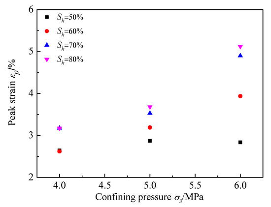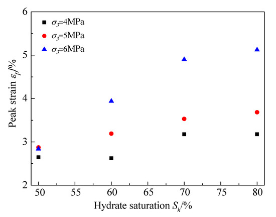 A peak strain (failure strain) is the axial strain corresponding to the peak strength. In general, εp increased with Sh (Figure 13). For the specimen under 6 MPa, when Sh was increased from 50% to 80%, εp climbed rapidly from 2.838% to 5.124%. It indicated that higher hydrate saturation led to the failure of specimen at a larger strain level.