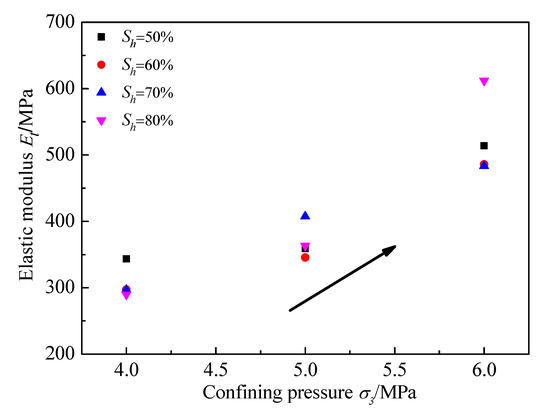 Elastic modulus (Et) was determined as a ratio of 50% of the peak stress to the corresponding axial strain. The variation of Et with σ3 is plotted in Figure 15. It states clearly that Et increased with σ3. For Sh of 50%, when σ3 ranged from 4 MPa to 6 MPa, Et climbed from 343.65 MPa up to 514.02 MPa. Et of the specimen with Sh of 80% was about twice of that of specimen with Sh of 50% under 6 MPa. A similar phenomenon can also be found in the effect of the confining pressure on the strength. Therefore, it indicates that the mechanical performance (both strength and stiffness) of the MH–coal mixture was significantly influenced by the hydrate saturation and the confining pressure.