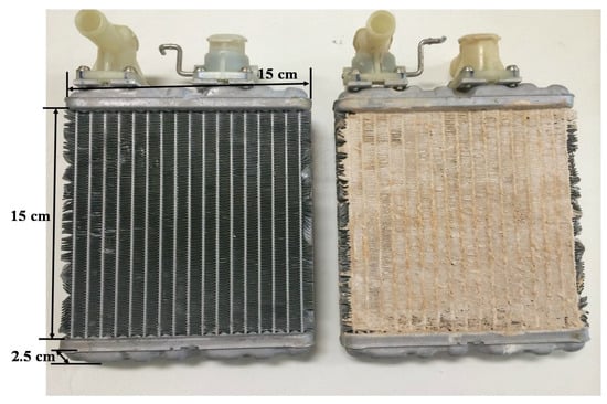 The corrugated heat exchanger, before and after being coated with the WSS + 40 wt. % LiCl, is shown in Figure 1. The main features of the composite material coated heat exchangers are listed in Table 2. The effective heat transfer area of the rectangular aluminum heat exchanger is 150 × 150 mm, and the overall dimensions are 170 × 150 × 25 mm. The coating procedure is listed as follows: