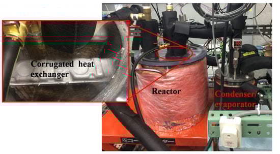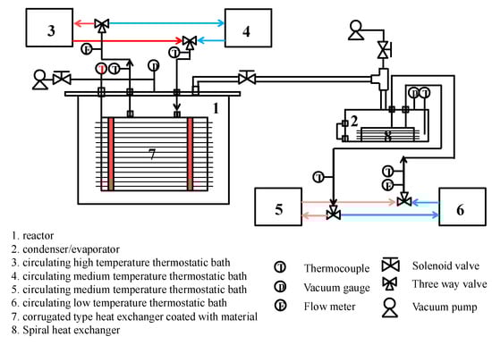 The schematic diagram of the experimental setup is shown in Figure 2. It consists of a vacuum reactor with two sorbent coated heat exchangers inside and an evaporator/condenser with a spiral fin tube heat exchanger inside.