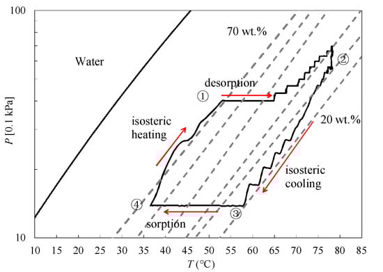 The tests were carried out according to the experimental condition described in Section 2.3 (Tin,ev = 12 °C, Tin,con = 30 °C, and Tin,re = 80 °C,). The real cooling cycle on the Clapeyron diagram obtained in this research is presented in Figure 4, which relates the equilibrium pressure and temperature at fixed water uptake. The isosteric chart of the WSS + 40 wt. % LiCl was measured at the equilibrium conditions using the thermogravimetric method [29]. The cooling cycle consists of the isosteric cooling process 2 → 3, the sorption process 3 → 4, the isosteric heating process 4 → 1, and the desorption process 1 → 2. It can be seen that the isosteric heating and cooling phases follow the theoretical cycle in general. Whereas the isobaric desorption phase deviates from the theoretical cycle, which is considered to be caused by the following two reasons: (1) the retard of the connection valve opening causes a pressure increasing in the desorption process before the water flows into and condenses in the condenser; (2) the mix of high temperature and medium temperature fluids supplied by two different thermostatic baths results in a lower supplied hot water temperature than the set value (cf. Figure 2). Then, it has to be heated gradually to the setting value by the thermostatic bath, thus resulting in a pressure increase. However, the above two problems are related with the thermal management of the components and the current sophisticated design of evaporator/condenser, which should be modified in our future work.