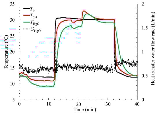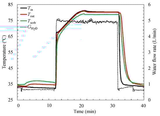 The water temperature inside the condenser/evaporator, and inlet and outlet temperatures of the heat exchanger on the condenser/evaporator in a cycle, are shown in Figure 7. The obvious temperature increase of the water in the regeneration process due to water vapor condensation can be observed. At the same time, the water temperature decrease from 2 to 12 min during the sorption process can also be detected.