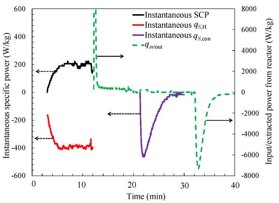 The instantaneous specific cooling power, specific heating power, specific condensation power (effective energy), and the input and extracted power from the reactor are illustrated in Figure 9. The instantaneous power is delivered by the heat exchangers of the reactor and the evaporator/condenser, respectively. This was calculated from the corresponding input and output temperature difference and the flow rate of the heat transfer fluid. Because there is only one reactor installed in the sorption chiller, the useful effect has to be produced intermittently. During the sorption process, the instantaneous cooling effect is about 200 W/kg of dry WSS + 40 wt. % LiCl, while the instantaneous sorption heat released is about 400 W/kg of dry WSS + 40 wt. % LiCl.