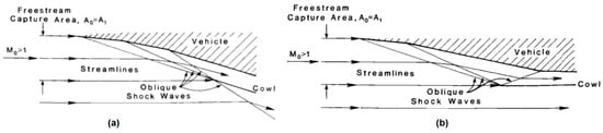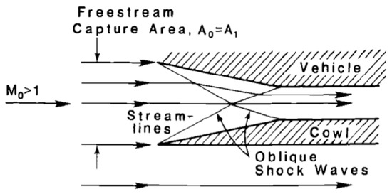 Figure 2a displays an external compression system where all the oblique shock waves are generated outside of the engine cowl, these oblique shocks combine and focus on the lip of the cowl. Since there are no other oblique shocks present inside the engine, the flow downstream from the final oblique shock is uniform and parallel with the walls [2]. An oblique shock wave is when a shock wave is inclined to the flow direction as opposed to normal shock waves which are perpendicular to the streamlines [5]. The uncaptured flow is forced to turn due to the existence of the cowl, this flow is turned the same angle as the flow entering the engine.