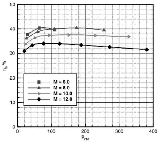 Overall scramjet efficiency at different pressure ratios and Mach number.