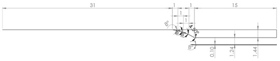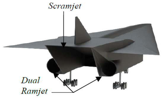The compression system designed in this project was part of the overall hypersonic propulsion system. Before the inlet and isolator of the scramjet were even designed, potential layouts of the engines and integration with the vehicle were investigated, because almost all hypersonic air-breathing ramjet and scramjet engines use the forebody of the vehicle as the external compression surfaces and the vehicle’s aft body as the expansion surface. Furthermore, the position of the engines and the sizing limits that the vehicle would be able to accommodate had to be decided [16,17]. It was established that the scramjet would be set in the middle and a pair of ramjets would be attached on either side. Each of the scramjet and ramjets was designed with an integrated turbojet engine needed to take the transport vehicle from rest to Mach 2.5, the speed at which the ramjet begins operation.