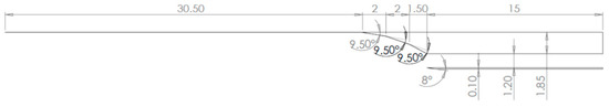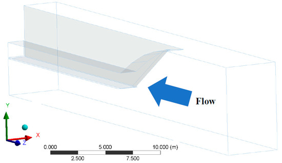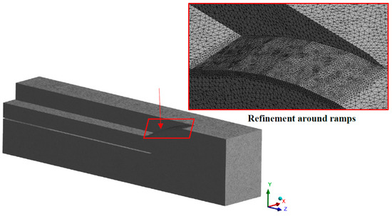 Figure 8 displays the schematic of a two ramp external compression system with deflection angles for the first and second ramp of 9° and 11.5°, respectively. The length of the flat surface underneath the vehicle’s forebody and the horizontal length of the ramps was set to 35 m to allow the development of the boundary layer. However, the exact distance of the flat surface does not make much of a difference as long as the flow is parallel the horizontal plane.