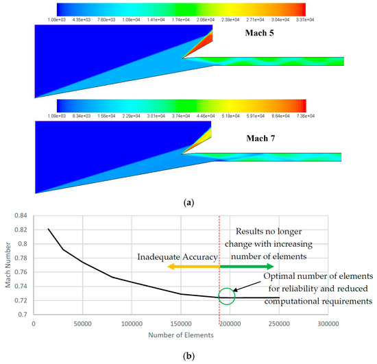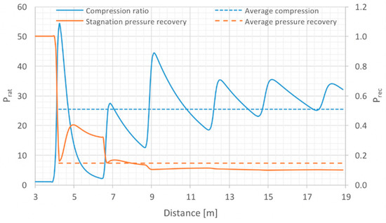 Table 3 presents the theoretical calculations of the Mach number downstream, compression ratio, pressure recovery, static temperature increase and adiabatic efficiency at a range of freestream flow speeds. As it can be seen at Mach 8 the flow should decelerate to Mach 3.788 after passing through the final oblique shock wave, which reaches compression ratio and pressure recovery of 44.54 and 0.52, respectively. The compression ratio is still not within the target range and the pressure recovery is relatively low due to the high angles of deflection.