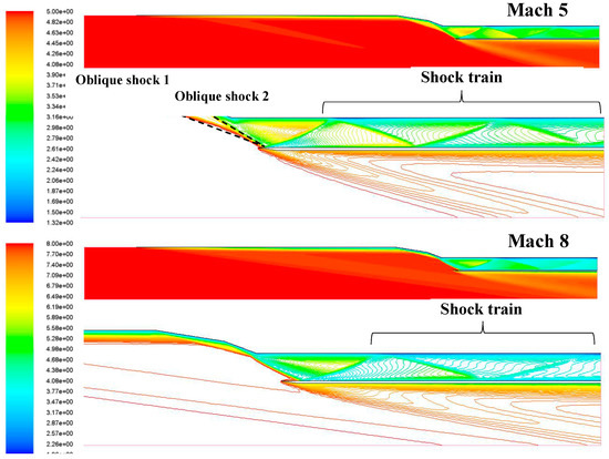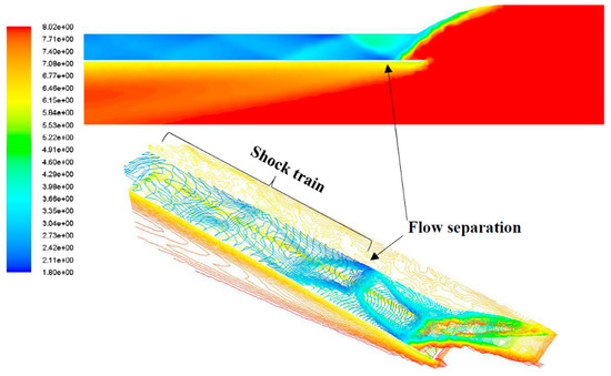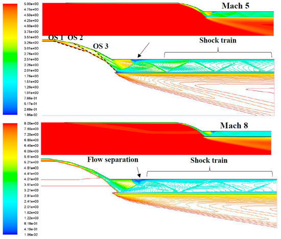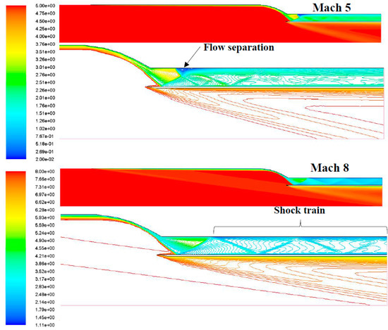 Mach contour of the rotated ramjet inlets at Mach 8.