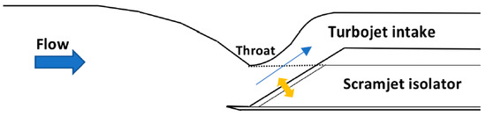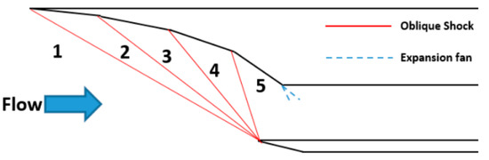 Figure 2b depicts an example of a mixed compression system i.e., a combination of external and internal compression surfaces; the converging inlet incorporates various bends in the geometry to turn the flow generating oblique shock waves so as to allow compression and deceleration of the flow to take place. This method of mixed compression systems can contain several ‘weaker’ oblique shocks in the internal section of the compression surfaces to produce the same downstream flow properties as just the external compression inlet. A disadvantage is that this results in increasing the length of the compression system but allows for a better shock train structure to develop in the isolator.