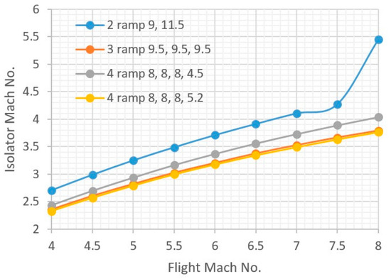 A 2-D approach allows a basic understanding of the oblique shock wave propagation through the inlet and isolator when varying the number of ramp and deflection angles. The isolator-capture area ratio (A3/A0) was calculated for each ramp at different flight Mach numbers.