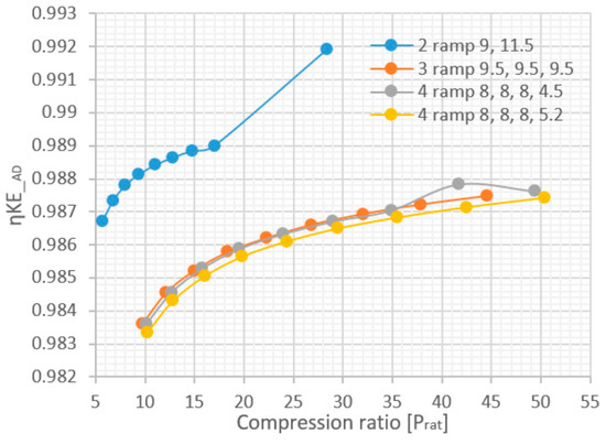 The kinetic energy efficiency can be used to quantify the performance of the compression system and usually for simplification the equation can be assumed to be an adiabatic process, which can be seen in Equation (1):