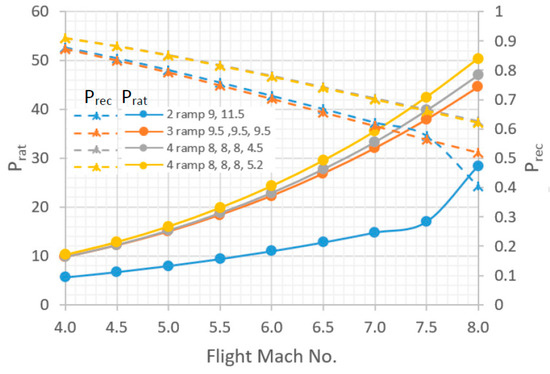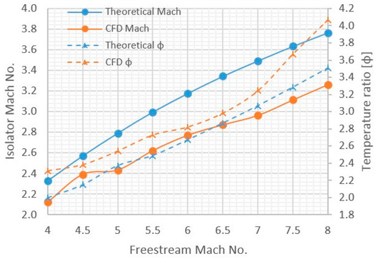 where is the ratio of the flow Mach number after passing through the final oblique shock wave and at freestream. Smart [8] has modified the equation for flight speeds greater than Mach 8 (Equation (3)):