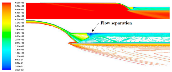 Mach contour of the over-under turbojet-scramjet hybrid engine in turbojet mode.