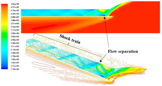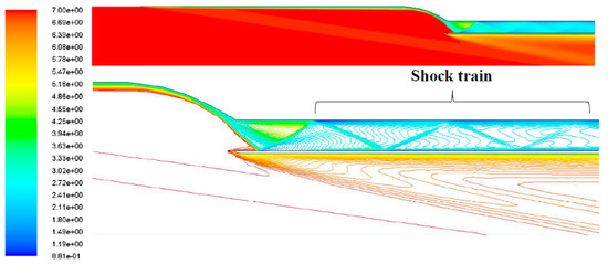 - Matsuo, K.; Mochizuki, H.; Miyazato, Y.; Gohya, M. Oscillatory characteristics of a pseudo- shock wave in a rectangular straight duct. JMSE 1993, 36, 222–229. [Google Scholar] [CrossRef]