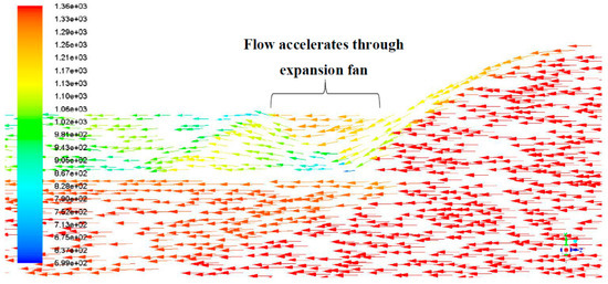 The velocity vectors at Mach 8 is seen in Figure 33. Due to the almost doubling of flight speed (from Mach 4.5 to 8) it can be seen that the deflection angle of the flow after passing through an oblique shock wave is lower resulting in a thinner shock layer at the wall and the flow higher velocity after the shocks. Consequently, the flow has greater kinetic energy to overcome the adverse pressure gradient and minimise flow separation. Resulting in the shock train to propagate much further downstream than during flight at Mach 4.5.
