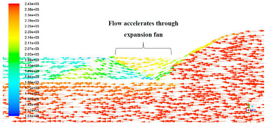 From the theory of oblique shock waves (Section 2), calculations were done to identify the theoretical performance of a scramjet inlet; Table 2 presents some of the important values such as compression and pressure recovery achieved from the two ramp system.