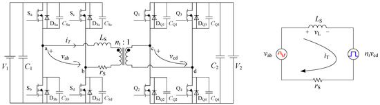 The circuit schematic of a DAB converter with its steady-state equivalent circuit is shown in Figure 1. Two active full-bridges are connected via an HF transformer and a power inductor . The transformer magnetizing inductance is assumed to be infinite, and the transformer leakage inductance can be included as part of . The power can be exchanged between two DC voltage sources and . The series resistance is an equivalent parasitic resistance including the total winding resistance and the on-state resistances of switches.