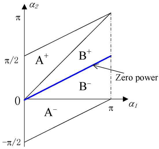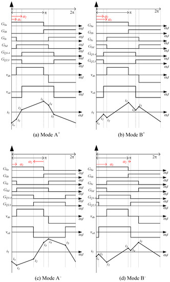 The two phase-shifts adopted in EPS include one inner phase-shift and one outer phase-shift . According to [14,15], the inner phase-shift should be used on the high-voltage side to achieve better performance. In this work, it is assumed that is higher than . Therefore, the inner phase-shift is defined as the phase delay from the turn-on moment of to that of , which ranges from 0– regardless of the power direction. The outer phase-shift is defined as the phase delay from the turn-on moment of to those of , , which can be either positive or negative. Based on the relationship among , and average power , there are four different steady-state operation modes: A, A, B, B. The superscript indicates the power direction, with “+” for the power flowing from to and “−” for the power flowing from to . In Figure 2, the steady-state waveforms of the four modes are illustrated with the gating signals of all switches presented. It can be seen that those modes differ from each other in the power direction, the relationship of the two phase-shift angles and the shape of the inductor current. The range of phase-shift angles in each mode is illustrated in Figure 3. In each steady-state time interval, a general differential equation can be written by referring to the equivalent circuit in Figure 1: