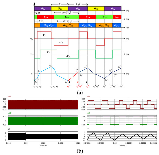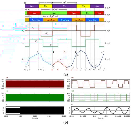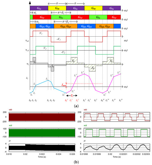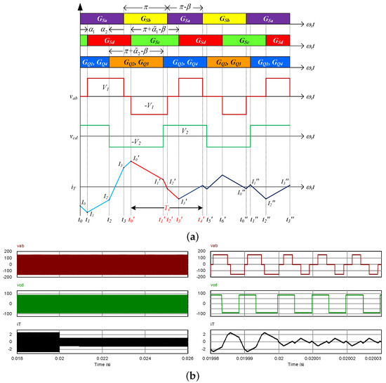 By equaling the two currents, the expression of for this transition can be obtained, which has the same result as Equation (12). Without noticeable overshoot and DC bias current in the transient process, the simulation proof shown in Figure 8b verified the effectiveness and correctness of FTM again. Furthermore, it can be observed that the polarity of outer phase-shift (the phase shift between the turn-on moment of and that of ) changes after the transition. It is seen that the Type II transition in negative power takes two more time intervals to complete the transient process. However, the expression of the key parameter still remains unchanged.