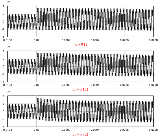 which indicates the consequence of Equation (8). The simulation of such a transition using DTM for is presented in Figure 4b with the waveforms of , and . In the left part with a large time scale, the overshoot peak current after the transient modulation can be easily identified from the envelope of the inductor current. The vertical asymmetry of the current waveform reveals the existence of a DC bias current. The details of the transition process are demonstrated in the right part, which matches the theoretical prediction given in Figure 4a. In an actual DAB converter, the overshoot current and non-zero DC bias current will decay gradually due to the non-zero parasitic resistance . In Figure 5, simulation plots of transient responses under DTM with three different are presented. It can be seen that the larger is, the faster the DC bias current will decay. However, a larger is not preferable since it results in more copper loss. Theoretically, the negative effects due to direct changes of two phase-shift angles exist in other cases of transition, as well. Therefore, the adjustments to the two phase-shift angles should be executed in a proper manner so that the total transient duration is significantly reduced and has no dependance on . Meanwhile, the temporal overshoot current and DC bias current are expected to be zero.