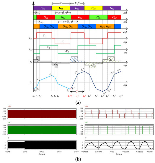 To give more evidence of this type, theoretical and simulated waveforms of {A, B} for negative power transfer are illustrated in Figure 8. It can be seen that the transient period includes four time intervals, which is different from the examples before. The durations of each intervals are , , , , respectively. The new steady state can be expected to start from . The instant current located at can be calculated as: