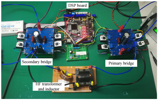 To verify the proposed FTM practically, a prototype of a DAB converter is built and tested in the lab. The voltage levels of two voltage sources are: = 150V; = 90V. The HF transformer is built using a ETD-49 ferrite core. The turns ratio is :1 = 10:10. Therefore, the converter voltage gain is . The measured magnetizing inductance and total leakage inductance are 390 H and 0.8 H, respectively. Including the leakage inductance of the transformer, the effective inductance of the power inductor is H. The switching frequency is kHz. The model of MOSFET switches on the high-voltage side is STP40NF20 with , and the model of MOSFET switches on the low-voltage side is IPP200N15N3 with . The key specifications of the experiment are concluded in Table 2, and a photo of the actual circuit setup is presented in Figure 10.