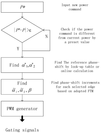 The layout for the implementation of the proposed FTM using a TI-F2835 DSP (Digital-Signal-Processor) development board is give in Figure 11. The flowchart of the program executed in the DSP is illustrated in Figure 12. The DSP program checks its input regularly for a new power command. Once a new power command of is confirmed, the power difference is evaluated. The actual power level P is calculated by sampling the DC voltage and current on one side. If is larger than a threshold value, the phase-shift selector will start to search for new of the target load level. As mentioned before, the strategy used in the phase-shift selector can be customized for the purpose of any performance requirement. In the experimental setup, a look-up table is just used as an example, of which the values of phase-shifts and their increments are selected for the purpose of the clear demonstration of the variation in the transformer current during the transition. Once the reference phase-shift angles are known, the increments of phase-shift angles and can be calculated and sent to the PWM unit. The detail of the PWM unit can be viewed from Figure 13. Three counters are set in up-down mode with a period of 750 cycles, which is equivalent to 5 s. The initial compared values are set at 375 to generate 50% duty cycle gating signals. Once the transient state is triggered in the interrupt service routine (ISR), the pulse-width of each gating signal would be modified according to and . The modification can be done by changing the period of the counter or changing the compared values on the rising or falling side.