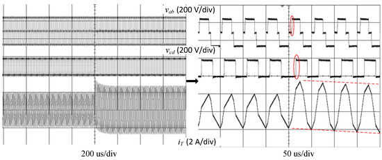 The simulated plots of such a transition case using FTM are presented in Figure 6b, which uses the same parameters as those in Figure 4b. With a time scale of 20 ms in the left part, there is no noticeable overshoot current in the envelope of the transformer current. The right part with a resolution of 10 s clearly matches the predicted waveforms in Figure 6a.