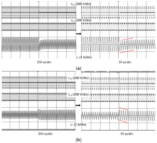 All transition cases, in which the initial mode and the final mode are the same, fall into this category. The transition {A, A} is used as an example to explain the application of FTM. The theoretical waveforms of the proposed FTM in the transition {A, A} are illustrated in Figure 6a. Compared with the DTM in Figure 4, a unknown phase-shift is cut off from the on-duration of S. Accordingly the turn-on moment of S and the turn-on moment of , will be delayed by and , respectively. Except for those changes, other switches maintain the original 50% duty cycle operation. Therefore, the required adjustments of are completed during . The durations of each interval in the process are , , . Although the whole transition process lasts until , it can be found that the durations of each interval after already match those of the new steady state. The instantaneous current at can be calculated as: