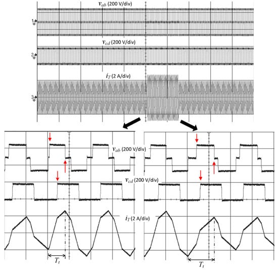 Experimental plots of transitions between two modes at negative power, {A, B} and {B, A}, are presented in Figure 19. The phase-shifts at high power W (Mode A) are , and the phase-shifts at low power W (Mode B) are . In the transition of {A, B}, the required adjustments are and , , while the polarities of those values should be reversed in the transition of {B, A}. Both transitions start from the falling edge of (from 0–). The difference is that lasts for four time interval intervals in {A, B} and five time intervals in {B, A}. The inductor current amplitude jumps from 2.52 A–1.19 A and jumps back after 30 HF periods. No noticeable overshoot current is observed from the current envelope at the transition moments.