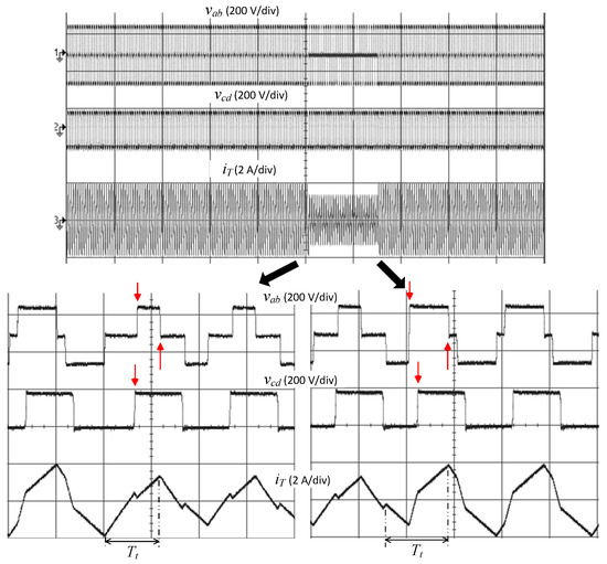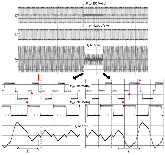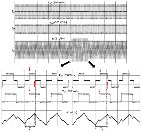 The theoretical reason can be viewed from the waveform of shown in Figure 4a, as well. It is seen that the voltage-time product of the inductor in the initial steady state is . Due to the implementation of the adjustment of gating signals, the voltage-time product then becomes . Although the voltage-time balance is still kept after , there is a net increment from to :