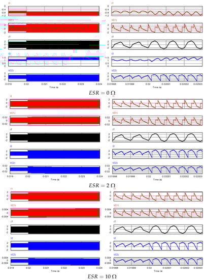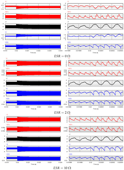 Simulation plots of the transition {A, A} using DTM with different equivalent series resistances (ESRs) of the filter capacitor.