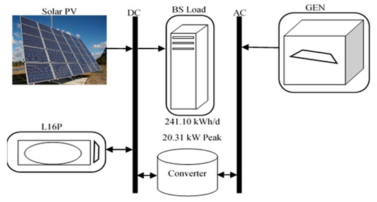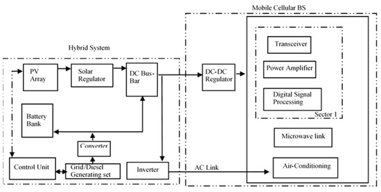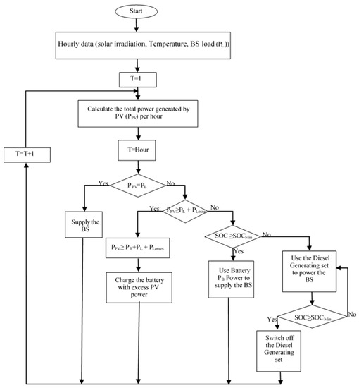 We consider Figure 1, which gives a block diagram of a typical BS powered by the hybrid power system (HPS). It is made up of two systems, namely, hybrid energy sources and the mobile cellular BS. In this system, the HPS supplies the power needed to the BS on the basis of the available energy resources from the solar PV, the battery, or the diesel gen-set controls by the flowchart in Figure 2. The mobile cellular BS system, as illustrated in Figure 1, uses direct current (DC), the load that is fed directly by solar PV modules. The excess electrical energy is stored in the array of the battery bank. Both the battery bank and diesel gen-set/grid system compensate for any discrepancy in energy level from the solar PV system. Figure 2 describes the power management and control operation of this hybrid system. It also gives the power source control management algorithm flowchart module. The purpose of this algorithm is to orchestrate a constant supply of power to the mobile cellular BS without any downtime in the operation of the BS from the HPS. The feasibility of this process depends on the availability of a constant supply of power to the BS. Therefore, the reliability of this HPS is determined by the loss-of-load probability (LOLP). The LOLP defines the average probability percentage of time over which the HPS could not meet the BS’s load requirements [19]. Figure 2 considers the LOLP in executing the power management process. Thus, the higher the LOLP, the lower the reliability of the HPS. The LOLP is taken to have an approximately zero value for the life period of 10 useful years for this HPS. It also manages the proper use of energy harvested by the solar PV panels. The HPS in Figure 1 is controlled using the scheduling method in Figure 2. The required power demanded by the mobile cellular BS is supplied by the power generated from the solar PV. During the day, excess energy is used to charge the battery for later use at night. During the night, the battery bank supplies the required power to the mobile cellular BS. The simulation and sizing of this HPS were carried out using HOMER. Solar power is seen as the most appropriate energy harvesting technology because of its global availability and good quality performance of the PV panels. Although the use of solar PVs to power mobile cellular BSs started with second-generation (2G) technology, their utilization is mostly in rural areas where there is no access to the grid system [20]. Nonetheless, the solar PV-powered BS is becoming widely accepted in urban areas as a result of a reduction in OPEX, advancements in renewable energy research, and the viability of new BSs with a low power consumption and that take up less space [21,22].
