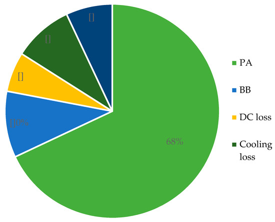 According to [16,24,25], a BS can be described as a link that provides a direct path from the mobile core network to the mobile stations covering various cells. The solar PV panel can power the BS directly because the BS is primarily a DC load that is mainly comprised of power amplifiers (PAs), a transceiver (RF), the baseband unit (BB), microwave backhaul, and auxiliary equipment such as lighting and air conditioning [25], as shown in Figure 1. Figure 3 shows the percentage of power consumption in each unit of the mobile cellular BS shown in Figure 1. There are several types of mobile cellular BSs, such as macro BSs, micro BSs, femto BSs, and pico BSs. These BSs are categorized on the basis of their size and power consumption. Of all these BSs mentioned, macro BSs are the most commonly used [6]. The total power requirement of the site was calculated using [26].