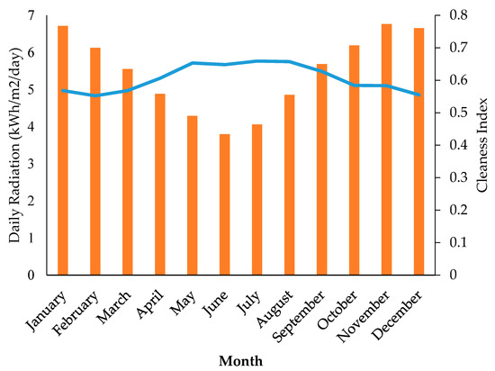 The average monthly solar radiation data used in this work is presented in Figure 5 and Figure 6. Furthermore, Figure 6 shows the average daily solar radiation for the town of Soshanguve to be about 5.4645 kWh/m2, while the average daily clearness index calculated was 0.605 using Equation (34):