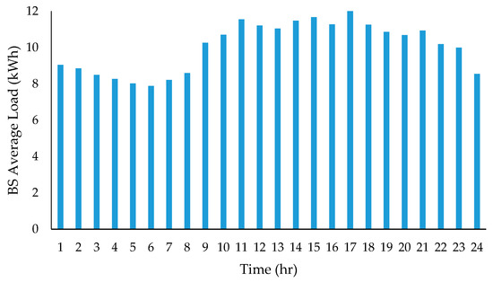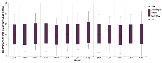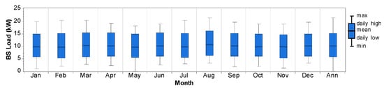 The efficiency of a solar-powered mobile cellular BS principally depends on the 24 h daily load profile of that BS. Hence, the sizing, designing, and reliability, as well as the modeling of the HPS, critically depend on the BS load. Therefore, the 24 h daily electrical load or power consumption of a mobile cellular BS situated on this site in Soshanguve was obtained using Equation (1) and was thus used in the modeling. Figure 7 shows the daily load consumption profile for the BS over the period of 24 h. Figure 8 shows the average seasonal load consumption for this mobile cellular BS per year. For this calculation, HOMER used the 24 h power consumption load profile over a period of 365 days to safeguard accuracy in the analysis using Equations (1) and (2).