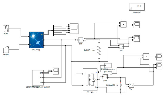 From Equation (4), the peak capacity of the PV array measured in kilowatts is represented by . The average daily solar radiation is the peak solar hour (PSH), measured per hour. Other factors such as dust, temperature, and wire losses that can affect the wattage output of the solar PV are expressed as the PV derating factor . The overall efficiency of the solar PV modules is called the derating factor. These PV arrays are interconnected in a parallel-series configuration and are grouped together in a unit to form what is referred to as a solar PV module. Therefore, through the use of Kirchhoff’s Voltage Law in Equation (5), the output current could be estimated in Matlab/Simulink tool box version R2018a by the MathWorks from Natick, MA, USA.