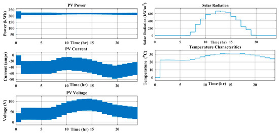 Figure 13 shows the characteristics of the PV module in P–V curves simulated in Matlab/Simulink. The model was simulated under the average hourly ambient temperature and solar irradiation of the BS site’s location as inputs. The results showed an increase in PV energy output as the solar irradiance increased, depending on the hour of the day. Therefore, both the voltage and the current drawn from the PV modules increased as the solar irradiance increased, but decreased when there was an increase in ambient temperature and vice versa. Therefore, there was a decrease in the output power as the ambient temperature increased and solar irradiance decreased. Figure 14 also shows a reduction in both the voltage and current output of the PV module due to an increase in input ambient temperature.