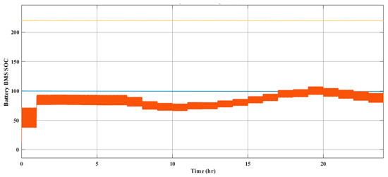 A battery system is a type of electrochemical energy storage device that stores and converts excess electrical energy (DC) from the solar panel or grid in the form of electrochemical energy for later usage. However, each battery technology has a separate way in which it must be treated. Majorly, the mathematical modeling of a battery system in a hybrid system depends on the battery state of charge (SOC), the depth of discharge (DOD), and the state of health (SOH) [36,37]. The SOC is the cumulative sum of charge or discharge transfers of the battery daily. The mathematical model of the battery, the fitted controller, and the converter is produced according to the following equations given in [38,39,40,41]. The size of the battery can be derived using Equation (13):