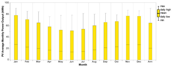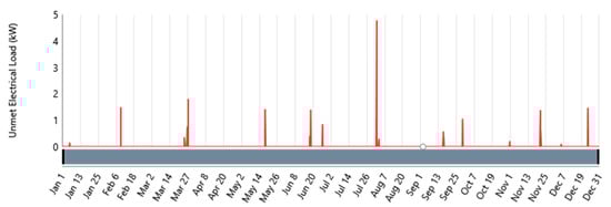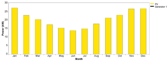 Figure 15 shows a graph of the average monthly time series load consumption of the standalone BS used. It shows an annual load consumption of 87,929 kWh using Equation (1). Using the average daily solar radiation of 5.465 kWh/m2 and all the parameters provided in Section 3.3.1, Figure 16 reveals the energy production by the solar PV to supply the daily load consumption of the BS with the result displayed in Figure 15. The result shows an annual total energy production of 146,847 kWh/year using Equation (4) for the generic flat-plate PV array operating at 4384 h/year in a standalone arrangement and of 109,498 kWh for the HPS arrangement using HOMER. With the BS load of 87,929 kWh/year obtained using Equations (1) and (2), there will be excess electricity of about 47,756 kWh/year. This excess energy will be used in case of an increase in load consumption, while the remaining energy will be stored in the battery for future usage. Figure 16 shows the monthly electric energy production of the solar PV module. Figure 16 further confirms the possibility of using the solar PV to achieve 100% renewable energy penetration. Consequently, the quantity of GHGs produced for this standalone solar PV is zero, thus making it ideal for the elimination of GHG emissions as compared to the exclusive use of the diesel gen-set or the HPS of the PV/battery/gen-set configuration. Using Equation (33), the calculated LOLP is 0.286% per year on average for an unmet load demand of 25.2 kWh/year. Thus, this system has an availability of 99.714% per year. Figure 17 shows the average monthly unmet BS’s load demand. Figure 18 shows the average monthly percentage of SOC of the batteries.