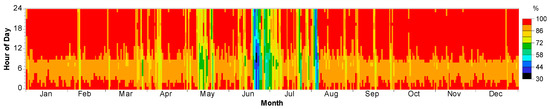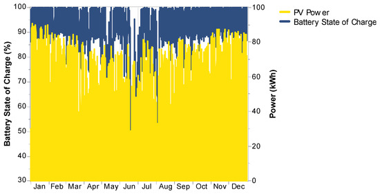 The Trojan L16P batteries used gave an annual throughput of 50,526 kWh/year, with an energy input of 56,355 kWh/year, an output of 45,192 kWh/year, and losses of 11,284 kWh/year due to aging. Figure 19 shows the data map define as DMap of the energy content of the batteries in a time series of average hourly values of the PV array power output with SOC over a period of 12 months for the solar-powered mobile cellular BS. The lowest percentage of charge is experienced in the months of March and June, while the highest is in the months of January and November, with daily GHIs of 6.716 and 6.763 kWh/m2/day, respectively, as displayed in Figure 20. Figure 20 further reveals that the battery bank is at its average maximum for 45% of the year and at its minimum for less than 1% of the year.