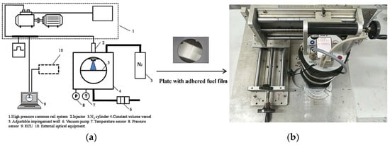 To investigate the characteristics of the adhered fuel film after spray impingement, the spray-impingement and film-thickness measurement system were used, which is shown in Figure 1. Figure 1a shows the constant-volume vessel with a common-rail injection system for fuel spray and wall impact including the high-pressure common rail system, the constant-volume vessel-injection system, and the electronic control unit. The injector with a single hole is mounted in the central top of the vessel and the angle between the spray direction and the plate’s horizontal plane could be adjusted by rotating the plate 15°–90°. Therefore, the plate surface will be impacted by the injected fuel and covered by the adhering fuel film. The blended mixture in the tank were premixed and transported to the injector by a high oil pump and the injection pressure can be controlled between 0 MPa–300 MPa by adjusting the solenoid valve opening. More details about this part of the system can be found in Reference [30]. After the injection, the plate surface with a fuel film will be measured by using the oil film sensor from Infralytic, which was illustrated in Figure 1b. This instrument is portable and uses infrared filter technology, which can determine the fuel film thickness on the metal surface accurately and rapidly. Its working principle is based on the Lambert–Beer law [36], which can calculate the liquid film thickness by using light absorbance after a light beam has passed through the film. Details of this device are described in References [31,35].